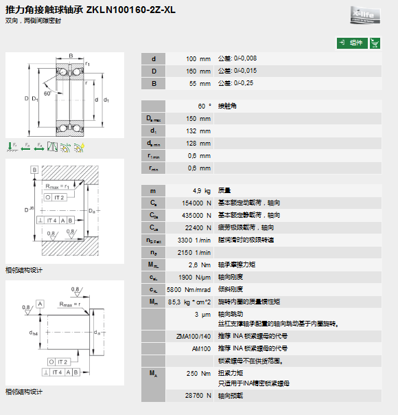 我司專業銷售INA軸承ZKLN100160-2Z軸承,如需購買此型號INA軸承請聯系我們銷售人員。 北京博瑞中興可提供此軸承的參數、樣品、圖片等資料.此軸承類型為推力角接觸球軸承,接觸角為60度,雙向,兩側間隙密封。我公司為舍弗勒集團INA軸承***經銷商,所售產品均為原裝正品、保證質量,請放心購買。訂購電話:010-69296385 QQ724685609