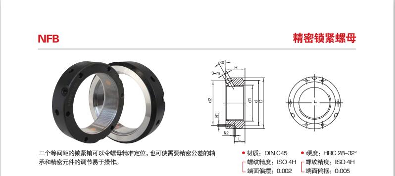 用途:NUT精密鎖緊螺母因其能有效提高組裝精度,改善主軸撓,安裝簡單,不易松脫,并延長工件使用壽命,而被廣泛應用于需要精密 強力 安全鎖緊的精密機構上。