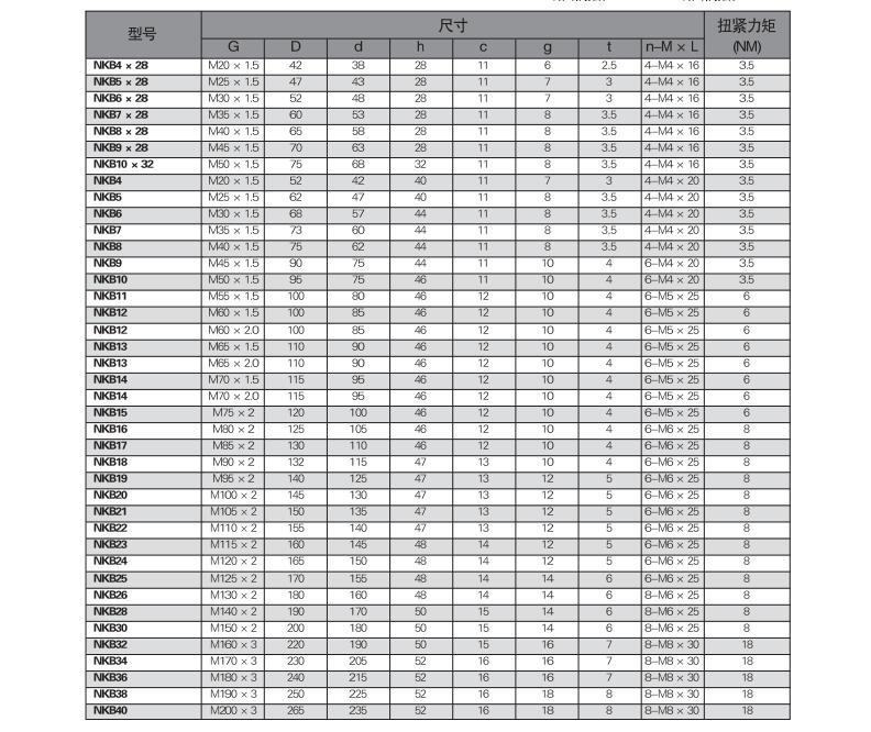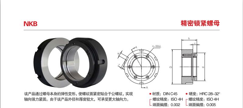 用途:NUT精密鎖緊螺母因其能有效提高組裝精度,改善主軸撓,安裝簡單,不易松脫,并延長工件使用壽命,而被廣泛應用于需要精密 強力 安全鎖緊的精密機構上。