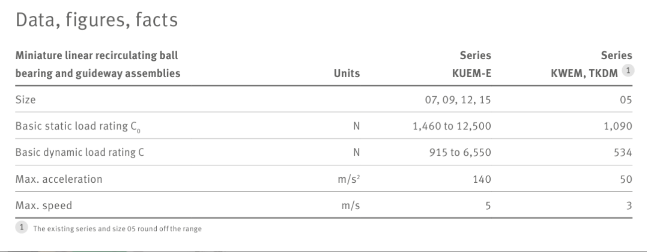 高度靈活性 作為標準,我們提供精度等級為 G2 的微型線性循環球軸承和導軌組件。屬于此精度等級的所有滑塊和導軌均可互換,從而能夠以***少的支出保持更換零件的庫存,并便于維護。為方便起見,導軌和滑塊可以單獨訂購,使您能夠訂購***大長度的導軌,并根據需要定制您的微型導向系統。導軌的***大長度為 1 m,尺寸 07 以下的長度***大為 2 m,尺寸 09 至 15 的長度***大為 2 m。 微型線性循環球軸承和導軌組件有標準型和寬型兩種版本,以及帶有長滑塊的微型線性系統,具有更大的負載能力。為了滿足更高的精度要求,微型線性循環球軸承和導軌組件還提供精度等級 G1。然后在交付前在內部匹配、定制和安裝滑塊和導軌。 客戶利益 ? 減少安裝時間,降低安裝過程中的廢品率 ? 滑塊和導軌的庫存成本低 ? 使用壽命長 ? 大多數應用的使用壽命 特點 ? 精度等級 G2 的滑塊和導軌可根據需要互換 ? 滑塊和導軌的兩端各有一個定位面 ? 優化的回球和新的滾珠保持系統 ? 低摩擦和可靠的密封概念 ? 大型潤滑劑儲液罐 ? 運行安靜平穩 應用 ? 增材制造工藝機器(3D 打印機) ? 激光系統 ? 電子產品生產中的光學檢測系統 ? 測量機 ? 醫療和食品行業 ? 醫療技術實驗室分析設備 ? CNC 義齒制造和牙科 X 射線設備 安裝簡單安全